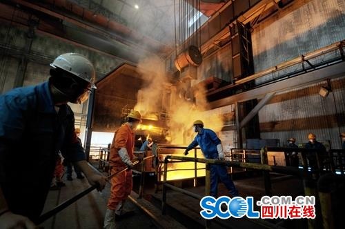 東汽鑄造事業部鑄鋼車間內正在冶煉鋼水。 徐涌 攝