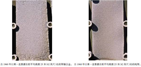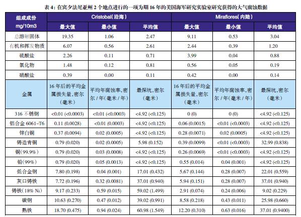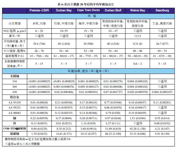 表3至表6的數(shù)據(jù)來自于日本、巴拿馬、Kure 海灘(北卡萊羅納州)和南非的試驗(yàn)地點(diǎn)。可利用這些數(shù)據(jù)在類似環(huán)境中選擇適當(dāng)?shù)慕饘俨牧希M(jìn)行生命周期成本分析。